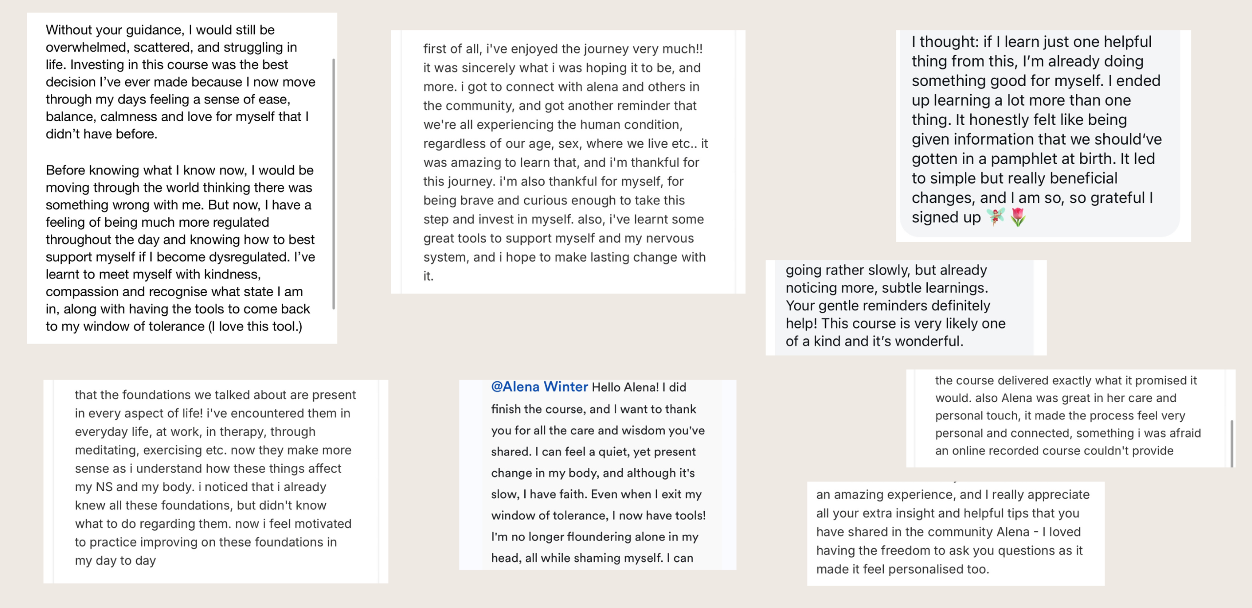 - Knowing what your nervous system needs in moments of activation or overwhelm, and being able to easily access tools to support yourself.
